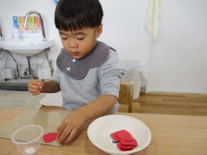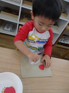 ケーキ作りで、いちごの形の色画用紙につまようじを使って、白い絵の具で粒を表現しました🍓